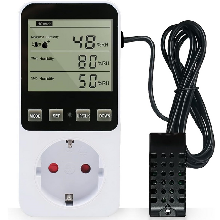 Este controlador cuenta con modo de humidificación y deshumidificación, lo que te permite establecer un rango de humedad entre el 20% y el 95% RH. Una vez configurado, el sensor interno del Clivex detecta en tiempo real los valores de humedad y activa o desactiva el dispositivo conectado (humidificador o deshumidificador) según el punto de activación y parada que hayas seleccionado.