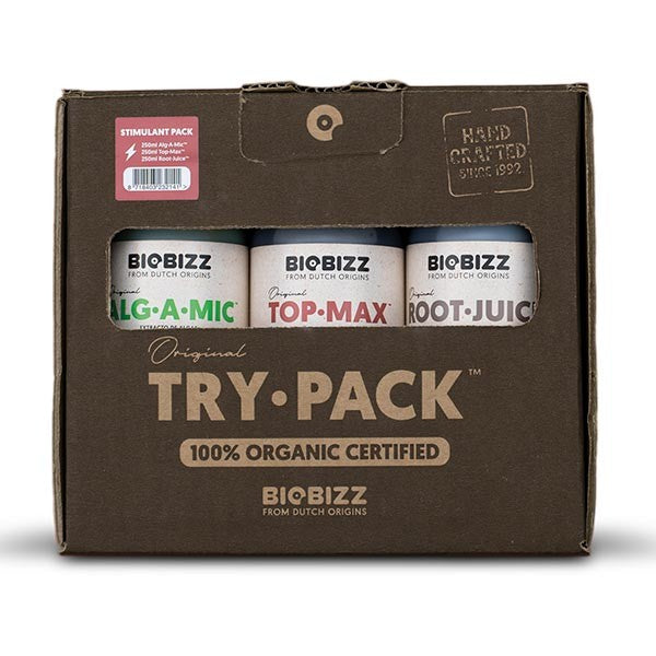 Try Pack Stimulant es una caja que incluye 3 estimuladores 100% orgánicos para tus plantas: Top Max, Root Juice y Alg-A-Mic. Top Max es un estimulador para la floración que genera un mayor número de cálices por toda la planta y posibilita que esta tenga una floración exuberante. Root Juice es un estimulador de la zona radicular que brinda un rápido desarrollo de las raíces y prepara a la planta para llegar con una estructura grande y robusta a la fase de floración. Alg-A-Mic es un producto revitalizante que protege las plantas frente a carencias y excesos de nutrientes. Lo puedes usar como preventivo o para revitalizar a aquellas plantas que sufran de estrés. Un producto que se aplica muy fácilmente en el agua de riego o pulverizando sobre las plantas. Los 3 productos se presentan en botes de 250 mililitros cada uno.
