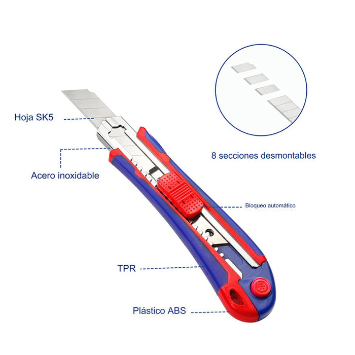 - Autobloqueo Positivo de la Hoja: Garantiza que la hoja permanezca fija durante el uso, proporcionando cortes precisos y seguros.