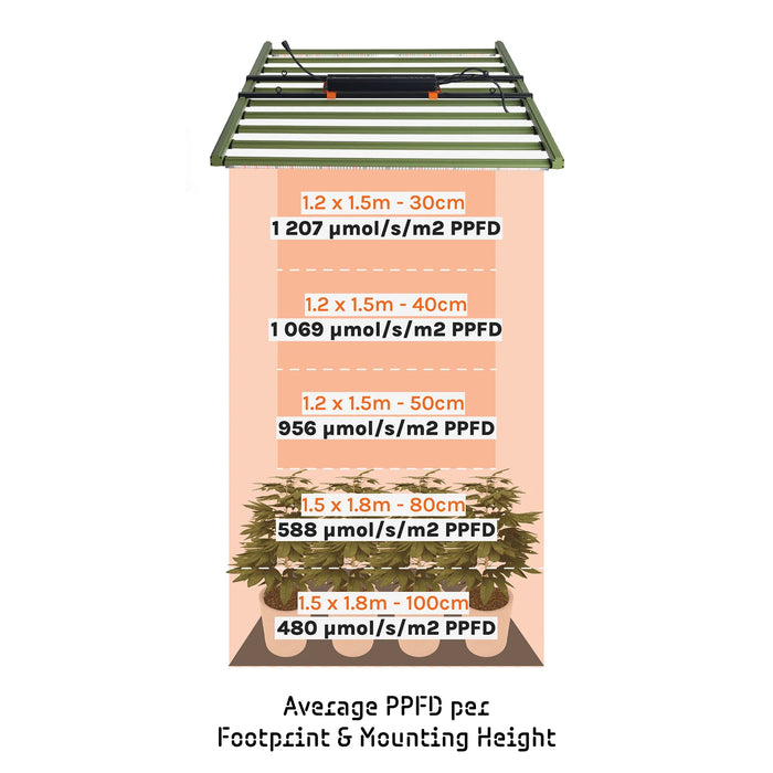 - Salida lumínica extrema – 3090 μmol/s PPF con una eficacia de 3.1 μmol/J, asegurando una penetración profunda en el dosel.