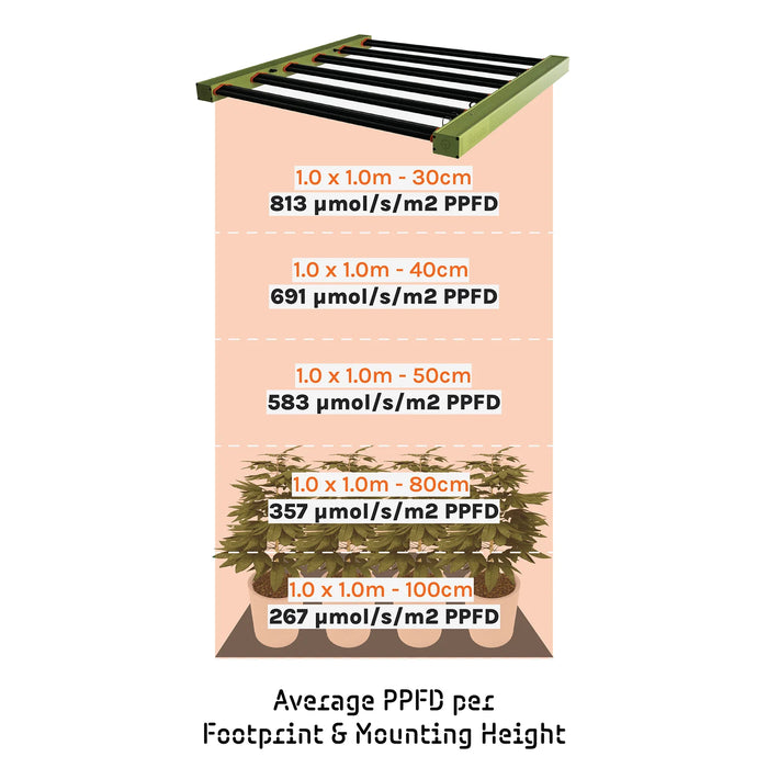 - Potencia optimizada – Consumo de 420W ±5% con una salida de 1155 μmol/s PPF y una eficacia de 2.8 μmol/J.